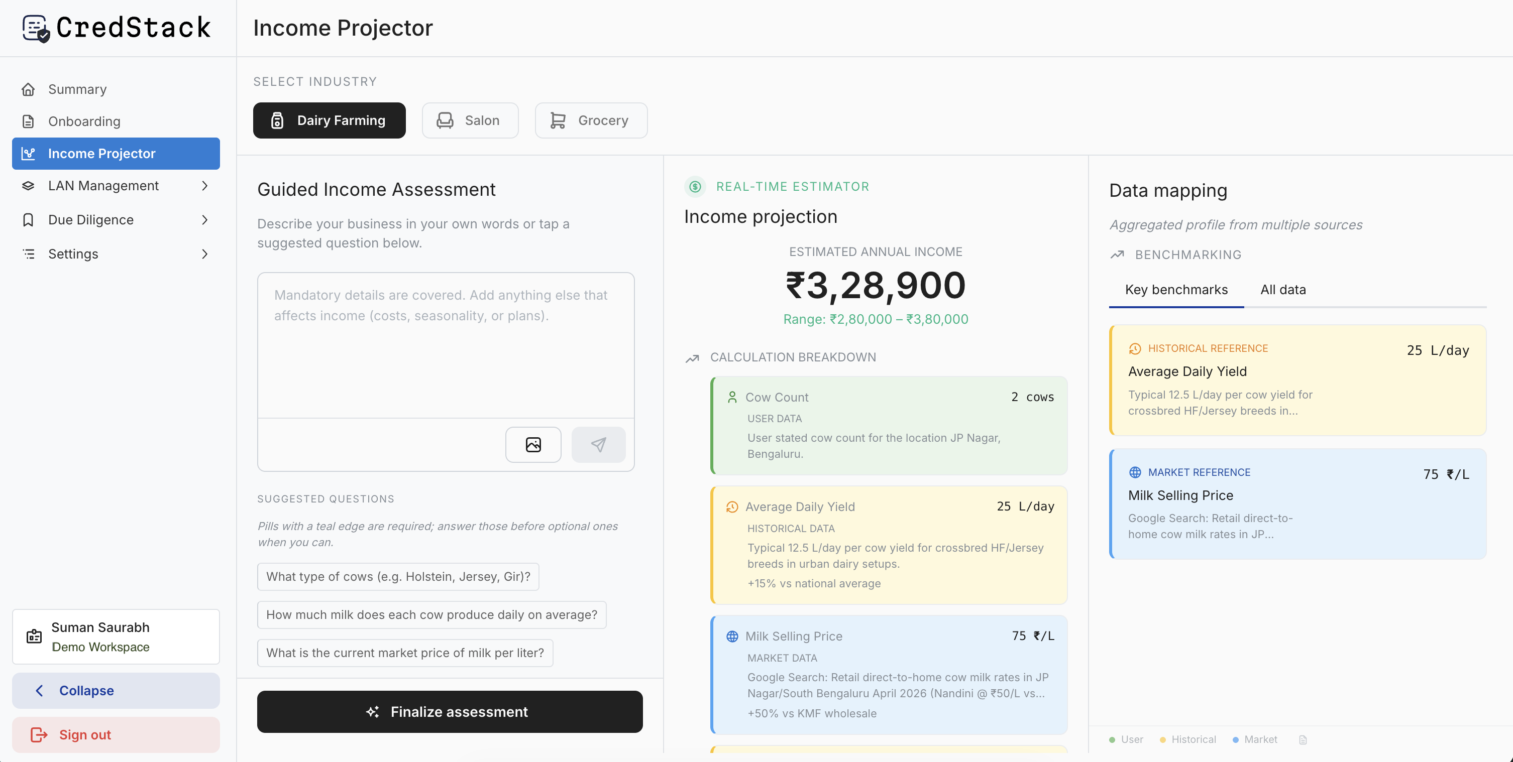 Select borrower category (e.g., dairy, grocery, salon) to activate industry-specific models and benchmarks.